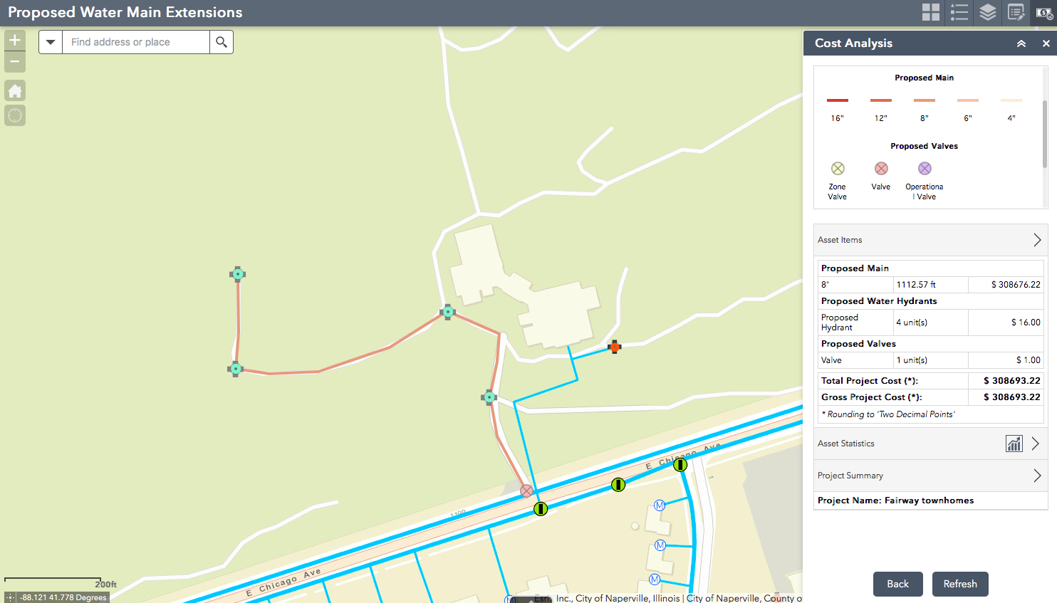 The Cost Analysis widget lets users sketch assets on a map and tally costs. So you could sketch new assets that might be constructed, sketch replacement infrastructure or even sketch in temporary asset in new locations for special events and estimate costs. You can also save proposed assets as projects for later use, sharing with others in your organization or further cost analysis.