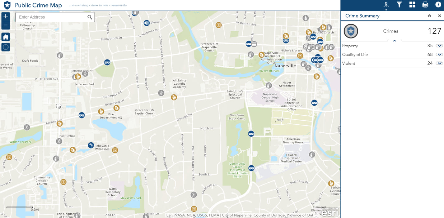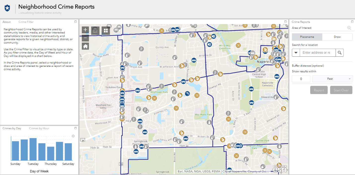 | Map | Neighborhood Crime Reports | A map used in the Neighborhood Crime Reports application to view historical crime activity and generate reports for a given neighborhood, district, or community |