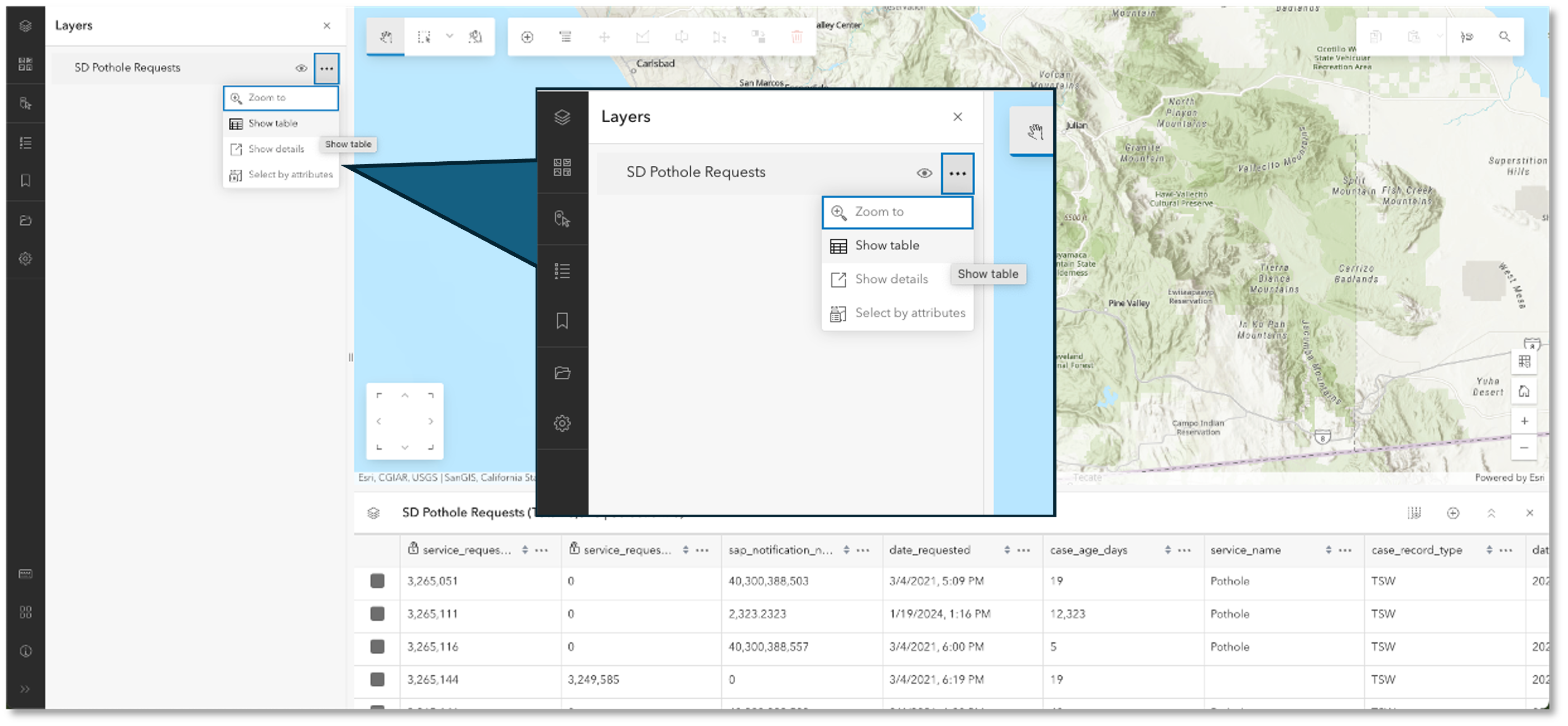 Showing tables can be a useful way to see the information associated with the feature and table layers in a map.