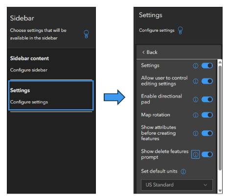 The template includes a variety of settings that give you more control- choose whether to show the Select by Attributes tool, display shortcut keys, or prompt users before deleting a feature. You’ll find most of these in the Settings section of the Sidebar tab.