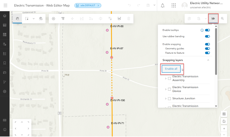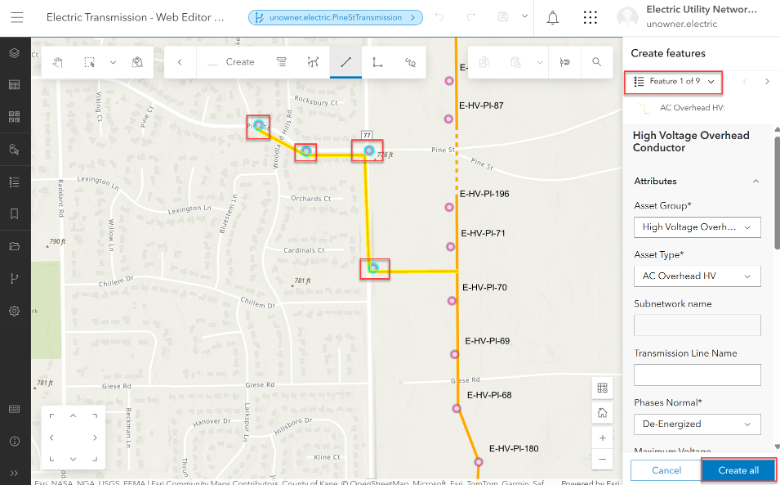 To begin editing, you will snap to the existing high voltage conductor and begin drawing. At each vertex, a pole and an attachment point will be created. When you have completed your edits, click the Create All button