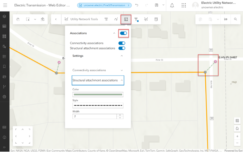 As part of the edit process, logical associations were created between the poles and the attachment points. To visualize the associations, we can turn them on to show the connectivity.