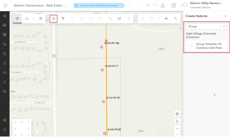 Click the Create button in the editing toolbar and then under the Create features pane, search for the group template. In this case, we have a group template called Group Template: AC Overhead with Poles.