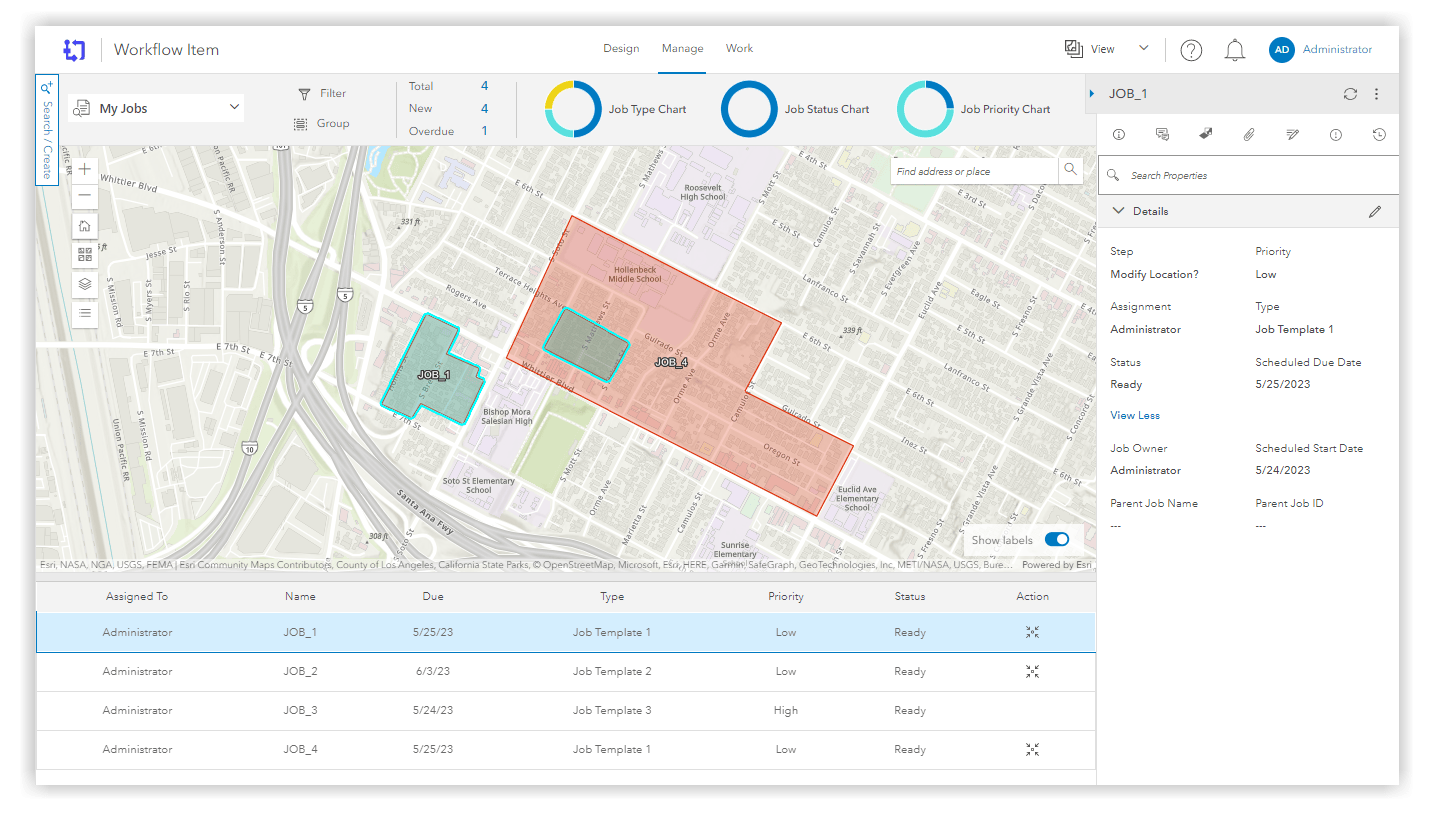 - Monitor the status of jobs in real-time to generate your own reports or integrate with other Esri technology, like ArcGIS Dashboards.