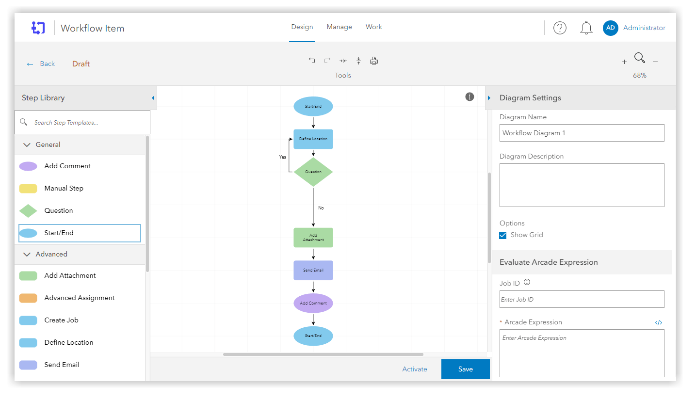 - Build and design workflows using an intuitive, drag-and-drop interface. Workflow Manager comes with a library of pre-configured steps, each with their own properties to perform unique tasks. Use steps to open a project in ArcGIS Pro, send a request to a REST endpoint, collect ArcGIS Survey123 surveys, and more.