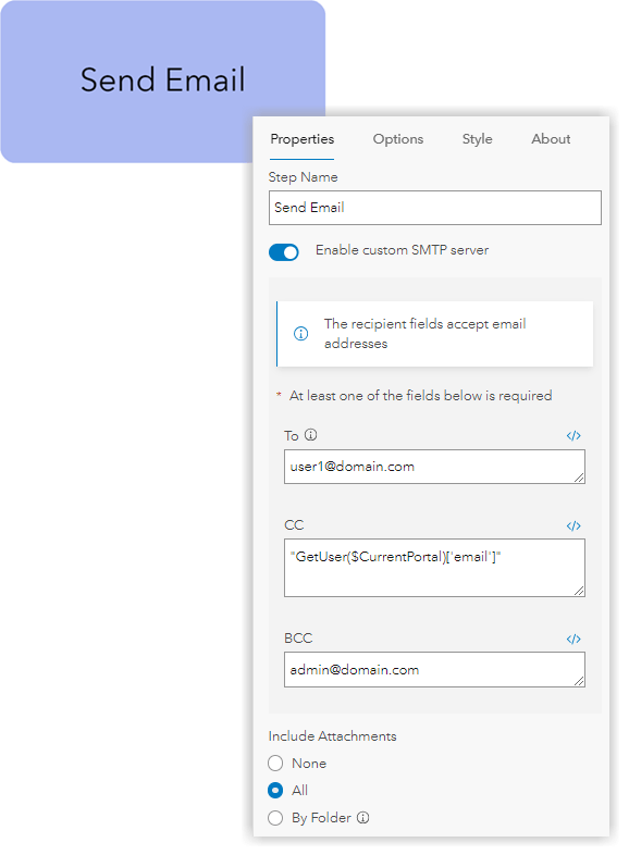 If you feel limited by the ArcGIS Online email notification service, you now have the option to configure custom SMTP server settings for your organization. Custom SMTP server settings enable new capabilities with the Send Email step, allowing you to include attachments, use email addresses instead of a username or group ID, enables the CC and BCC textboxes, and allows you to send emails through your organization’s domain.