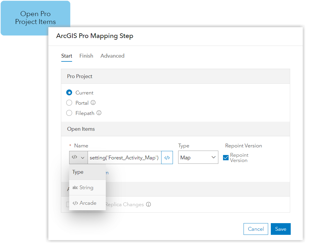In addition to synchronizing replica changes with the Open Pro Project Items step, you now have the option to use a string value or an ArcGIS Arcade expression to reference the name of the project item. With Arcade expressions, you can use a dynamic value, allowing you to reference items from an extended property or a user-defined setting.
