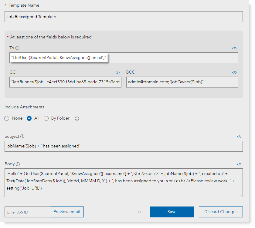 $newAssignee is a new ArcGIS Arcade variable that returns the username of the new user assigned to the job. Configure this variable with an email template and associate it with the Assign Job job activity to automatically send email notifications to the new user assigned to the job. $newAssignee can only be used with email templates and will not return the username in other parts of the web app.