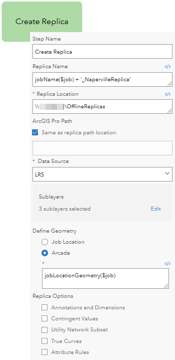 The key component of our workflow diagram replicates the data for the defined area of interest, saves it to a shared file location, and allows the mobile worker to access and edit the layers in the field. The Create Replica step is used to create a branch version of the data, which stores it in the form of a mobile geodatabase accessible by ArcGIS Pro.
