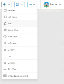- You will now have an empty dashboard. Let’s add a map. In the upper right corner, there are four dropdown menus. Use the first menu to add an existing map to the dashboard.