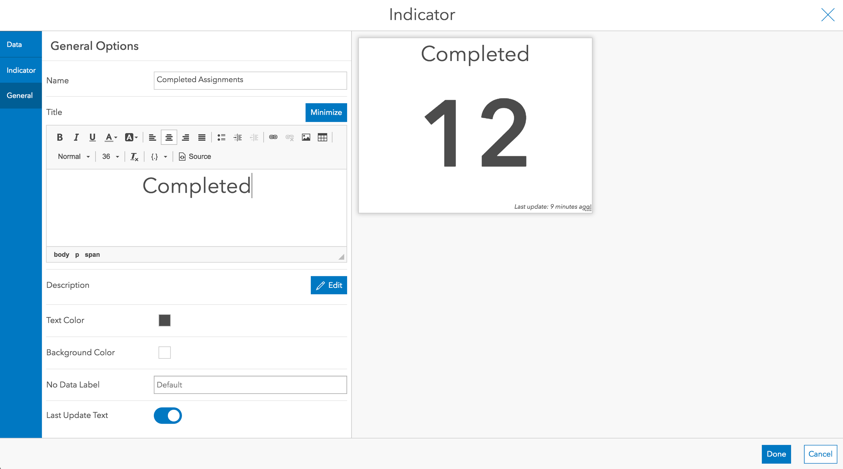 - Let’s now add a descriptive title to this indicator. Open the General tab, and add a Name of “Completed Assignments”. Additionally, use the rich text editor to set the Title to “Completed”. Center the text and change the paragraph format to Heading 3. The indicator should now look like the following: