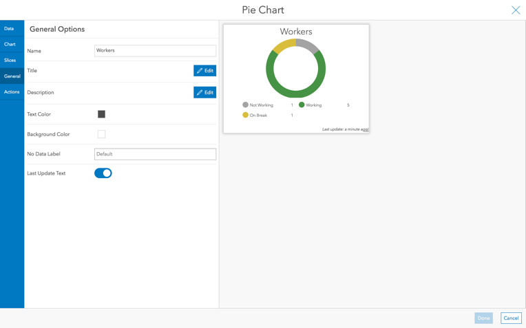 - The default type of pie chart uses categories from Grouped Values. Let’s use this option since we want to show the number of workers that are “working”, “not working”, or “on break.”