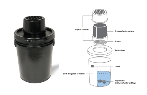 The black container holds 10 liters of a water and hay infusion. The dark color of the trap and the odor from the infusion attracts female Aedes aegypti mosquitoes, looking for somewhere with water to lay their eggs. Mosquitoes enter the capture chamber but a screen prevents them from getting close to the water. Ready to lay their eggs female mosquitoes land on the sticky adhesive surface inside the trap and become stuck. Field technicians will collect the capture chamber once a week and take it to the laboratory where mosquitoes are then removed from the sticky paper, identified and counted.