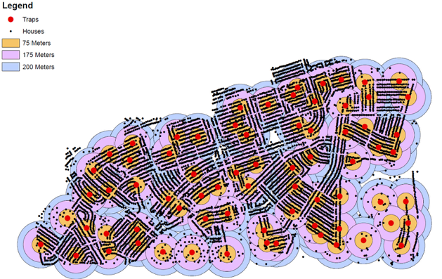 Vector Control – based on the results of weekly surveillance, the traps with the most mosquitos are selected to perform vector control. Vector control includes breeding site reduction, larvicide application on breeding sites, and education of residents on how to properly clean and remove mosquito breeding site locations. The selection process starts by buffering each trap, then selecting the homes that fall within each trap buffer. The trap with the most mosquitoes that week will have 1st priority, the homes that fall within that trap buffer are selected and loaded into Workforce as 1st priority.