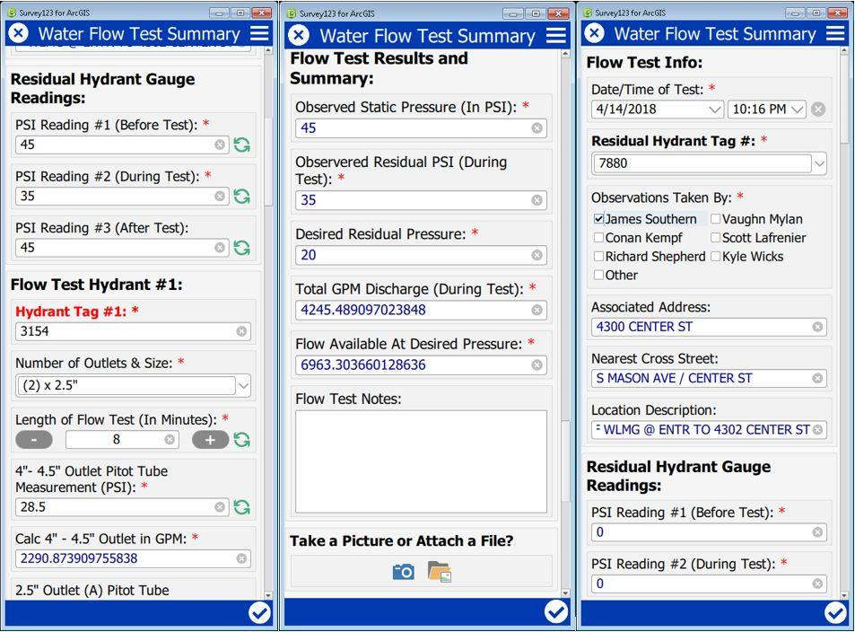 Heute nutzen die Außendienstmitarbeiter*innen Survey123, Python und ArcGIS Online und können auf diese Weise vollständig automatisiert die Durchflusstestergebnisse in einem Survey123-Formular erfassen. In das Formular eingebettete Durchflussberechnungen liefern den Außendienstmitarbeiter*innen sofortige Ergebnisse. Die Durchflussergebnisse müssen nicht mehr im Büro in eine Arbeitsmappe eingegeben werden. Außerdem übernimmt Python die Durchflusstestdaten aus ArcGIS Online und erstellt einen Durchflusstestbericht mit einer eingebetteten Karte. Der Bericht wird per E-Mail an die Mitarbeiter*innen am Schalter gesendet, die den Bericht dann an die Kund*innen weiterleiten. Die Ergebnisse werden in einem Dashboard für Techniker*innen und das Management freigegeben und können dort weiter analysiert werden. Der neue automatisierte Prozess ist zeitsparend und ermöglicht wesentlich kürzere Bearbeitungszeiten bei Hydranten-Durchflusstests für Kund*innen.