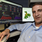 A business professional working at a computer displaying a mapping dashboard, overlaid with orange and black charts and graphs