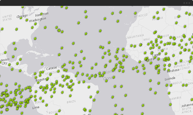 Ingest nearly any type of streaming data feed with out-of-the-box connectors for common data streams and data formats, or create custom connectors. Integrate real-time data with historical data within your enterprise geographic information system (GIS) to analyze change over time.