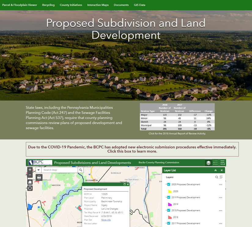 In Bucks County, PA, the planning department uses ArcGIS Hub to publish up to date information about proposed subdivisions and other developments. Further, they show the history of development in the area. I love that part of it, because it helps provide context to other proposed developments. There’s also a place to fill out an application for a development and contact information. Geography is at the center of these decisions, so Bucks County uses web maps to communicate these issues in a clear manner.