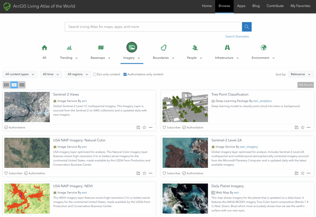 You may find that your own data holdings are not enough to drive the analysis and automation you need. There are a variety of other external image sources you can leverage to enrich your imagery data holdings. Staying true to an enterprise imagery approach, you should look to leverage data easily integrated via image services. There are a variety of external sources that you can connect to your existing enterprise today, including ArcGIS Living Atlas of the World, government data providers, and open-source holdings. Many of these organizations provide data at no cost and provide APIs or STAC connections to enable your enterprise access.