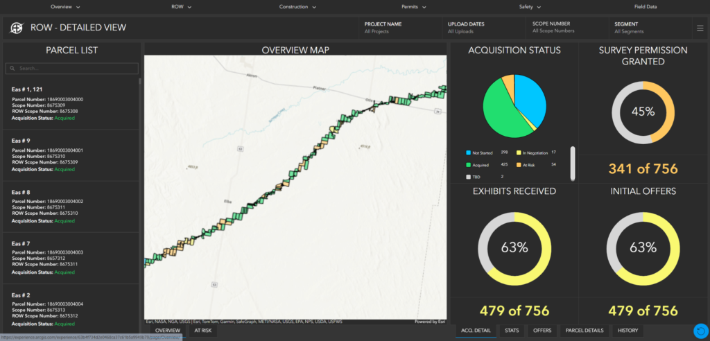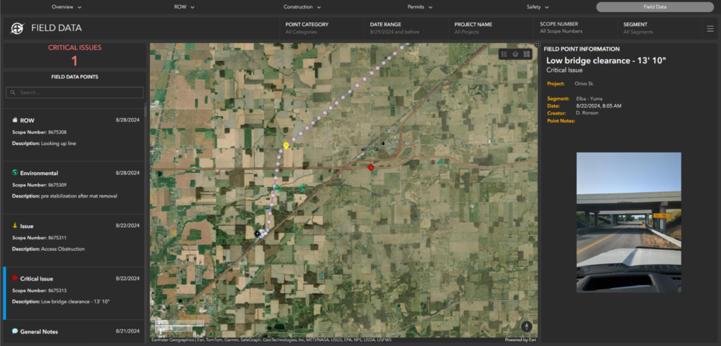 Aldridge’s work with Dawood Engineering and the introduction of a GIS portal completely transformed Aldridge’s ROW workflow and construction tracking workflows, centralizing project data into a single platform that reduced errors, improved communication, and accelerated decision-making. This real-time data access allowed for the quick identification of critical issues, thereby mitigating risks, delays, and costly overruns. The transition from outdated KMZ files to a workflow ensured that all team members had access to accurate project data, which improved collaboration and tracking accuracy.