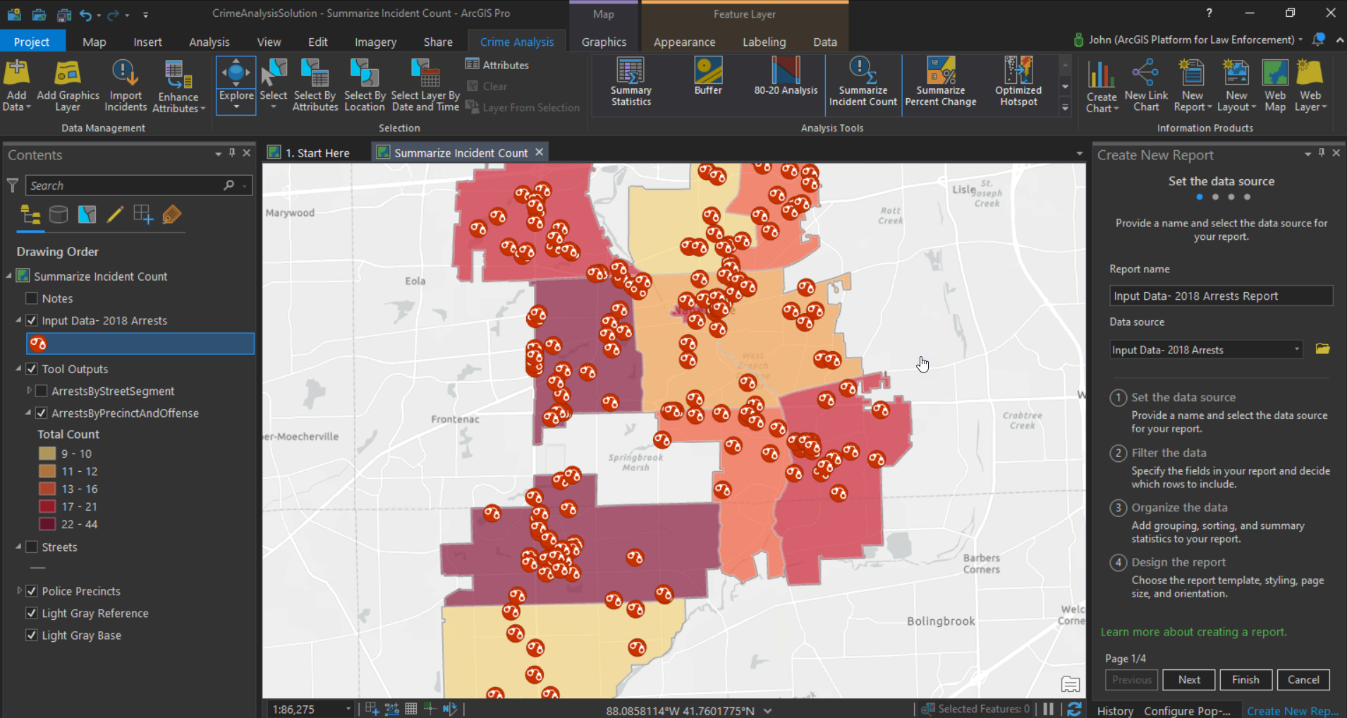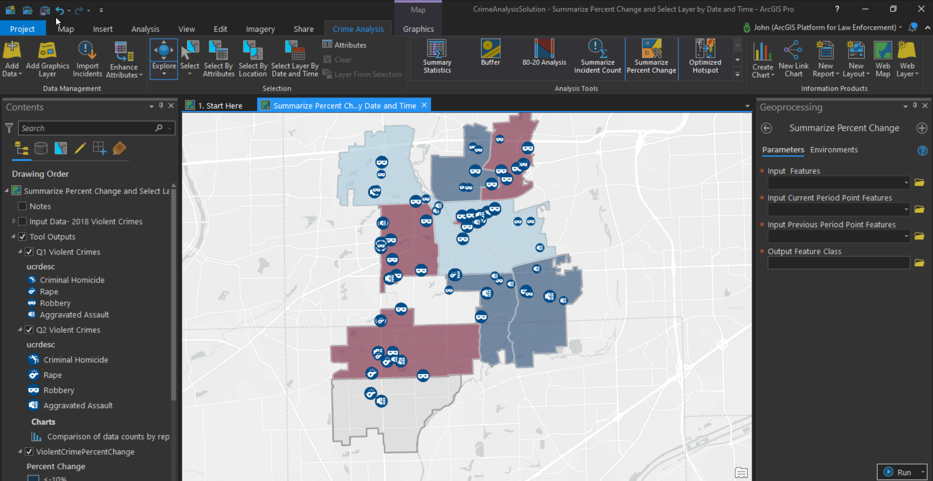 To do this analysis, we will use a pair of tools in the Crime Analysis solution: Summarize Incident Count and Summarize Percent Change.