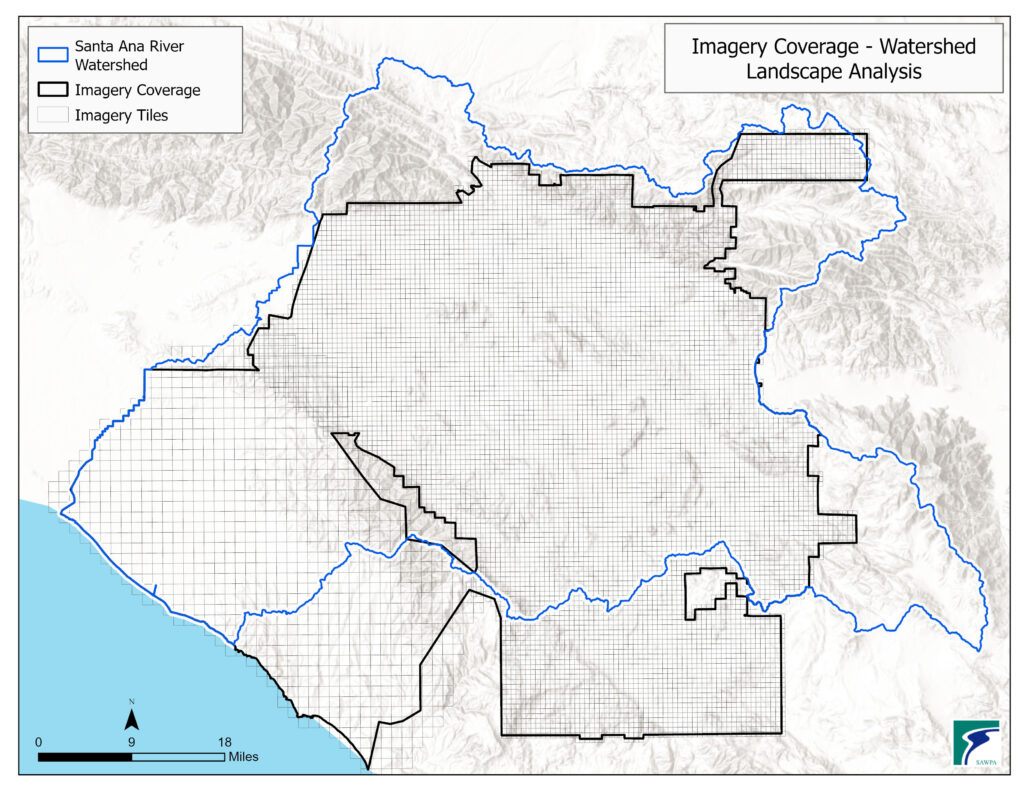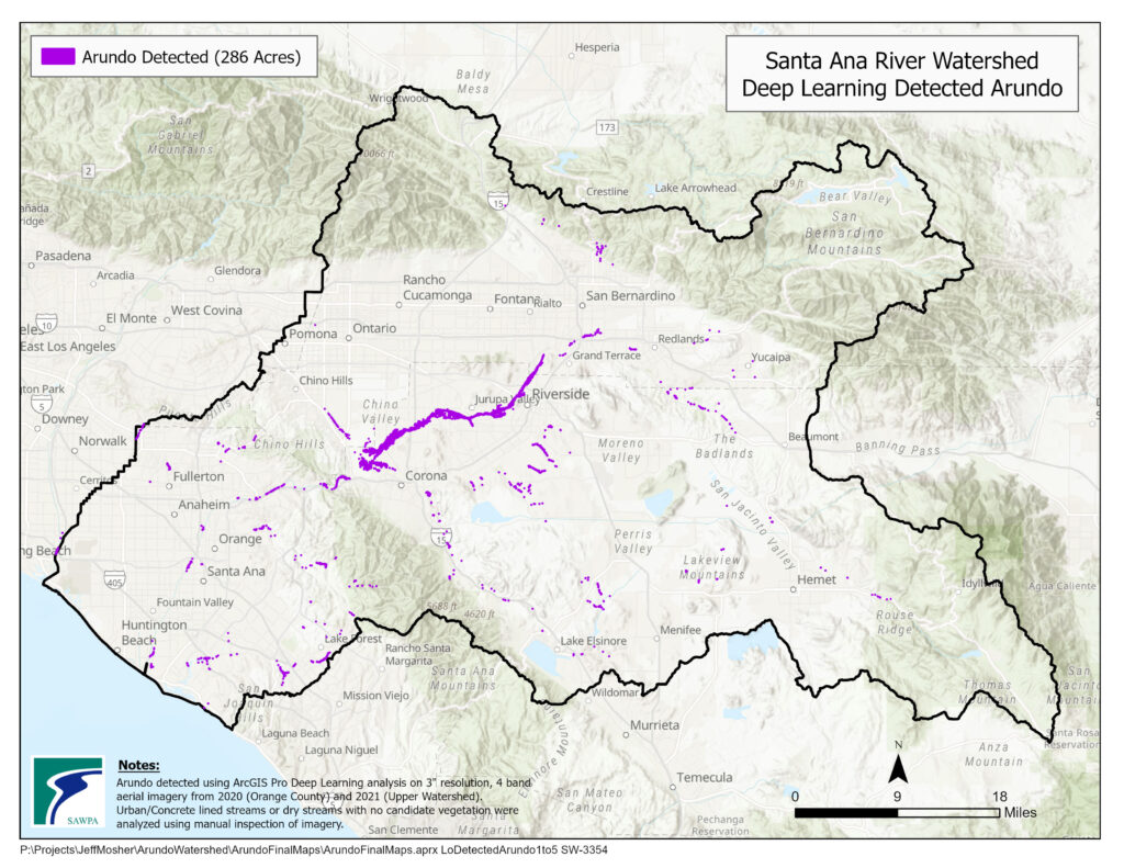 The watershed is very large and encompasses approximately 2,800 square miles across four counties in Southern California, including western Riverside and San Bernardino Counties, northern Orange County, and a slice of southeastern Los Angeles County. Because of the watershed’s large size, SAWPA did not have the time or resources to do field investigations, and digitizing Arundo plants from aerial imagery across such a large area would not have been accurate or timely.