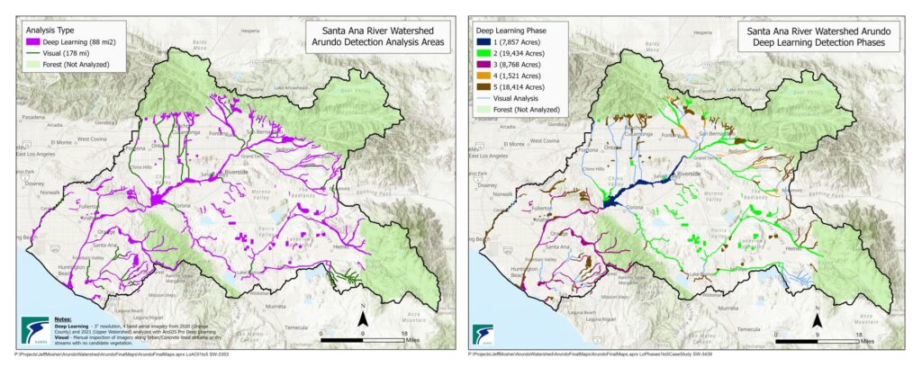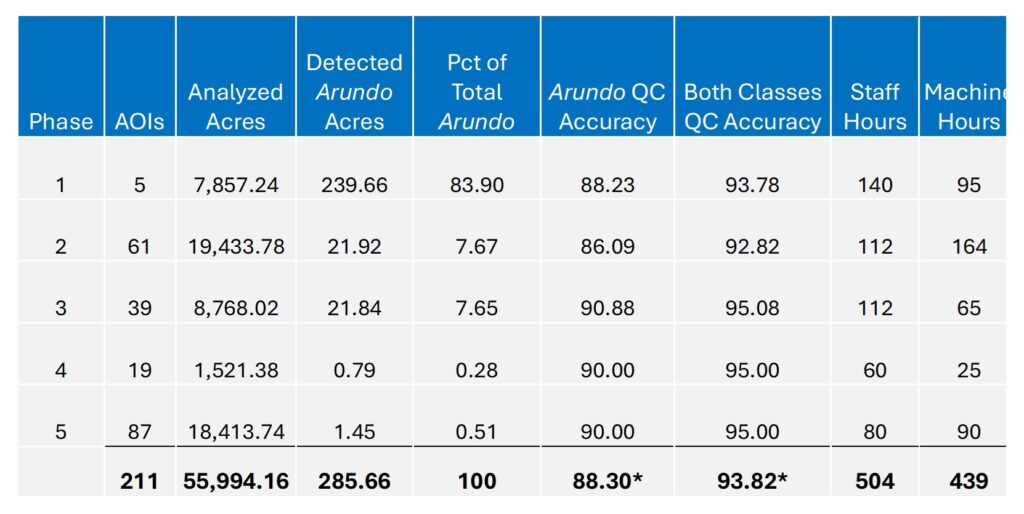 The project was divided into five phases based upon geography and area type. In addition to deep learning analysis, we conducted a visual inspection of the imagery for Arundo along concrete-lined stream channels and dry streambeds with little or no vegetation.