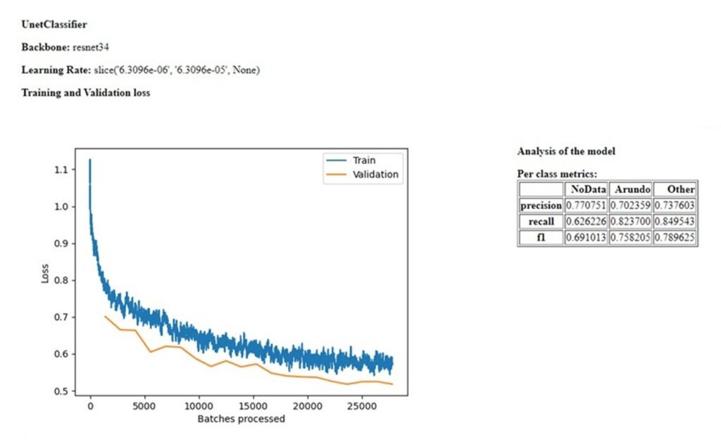Deep learning effectively identified Arundo occurrence, providing a solid estimate of its presence in the watershed. The Arundo predictive accuracy was 88 percent, and the model accuracy was almost 94 percent over the entire watershed area. The amount of Arundo detected was significantly less than the Cal-IPC estimate 15 years ago, indicating that Arundo removal efforts have been effective. We might have underestimated Arundo somewhat in the drier parts of the upper watershed, as field investigations conducted after the analysis found Arundo in some areas where the deep learning analysis didn’t. This could have occurred because different vegetation types were harder to distinguish in drier areas as compared to wetter areas, and some of the imagery in the upper watershed near the mountains was a little blurry.