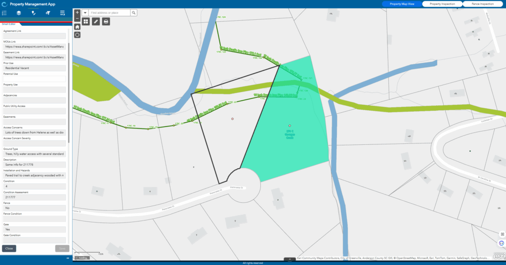 With the property inventory established, the next step focused on integrating the GIS data into the organization’s asset management system to support routine property inspections. At this stage, GIS played a pivotal role in connecting the property GIS data with the computerized maintenance management system (CMMS). The asset management team worked closely with the facility management team to develop property inspection templates that aligned with the attributes defined in the GIS database. These templates ensured field staff consistently recorded property conditions and observations, including potential hazards, site signage, and any evidence of illegal dumping. To maintain data synchronization, the GIS team developed a daily scheduled SQL script that automatically overwrites inspection data back into the GIS database.