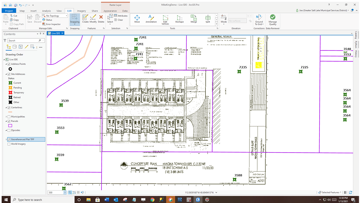 The district faced multiple challenges, ranging from georectifying images to serve as a background on new plat maps to adding streets in a manner compliant with their existing centerline schemas. Borgione wrestled with a better way to modify and split intersecting roads on street centerlines and created his own schema (Available in the GIS Community).