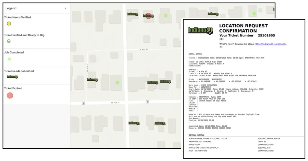 Excavation requires calling 811 before any digging can occur. Upon submission of an 811 ticket, utilities have a two-to-four-day window to mark and flag the property, and the ticket is valid for 20–21 days. For this project, attachments were enabled on the feature layer so that the tickets, field photos, and documentation could be stored directly on each inventory point feature.