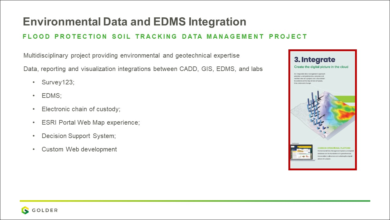 One of the things affecting the environmental consulting industry is the integration of environmental data and environmental data management systems (EDMS). The transformation from paper-based field data collection and reporting to mobile has accelerated over the last five years. The integration of GIS with the EDMS has not been seamless. Integrated solutions have been a frequent project expectation. Having environmental and EDMS solutions that work together and integrate well is incredibly important for the success of our projects and clients.