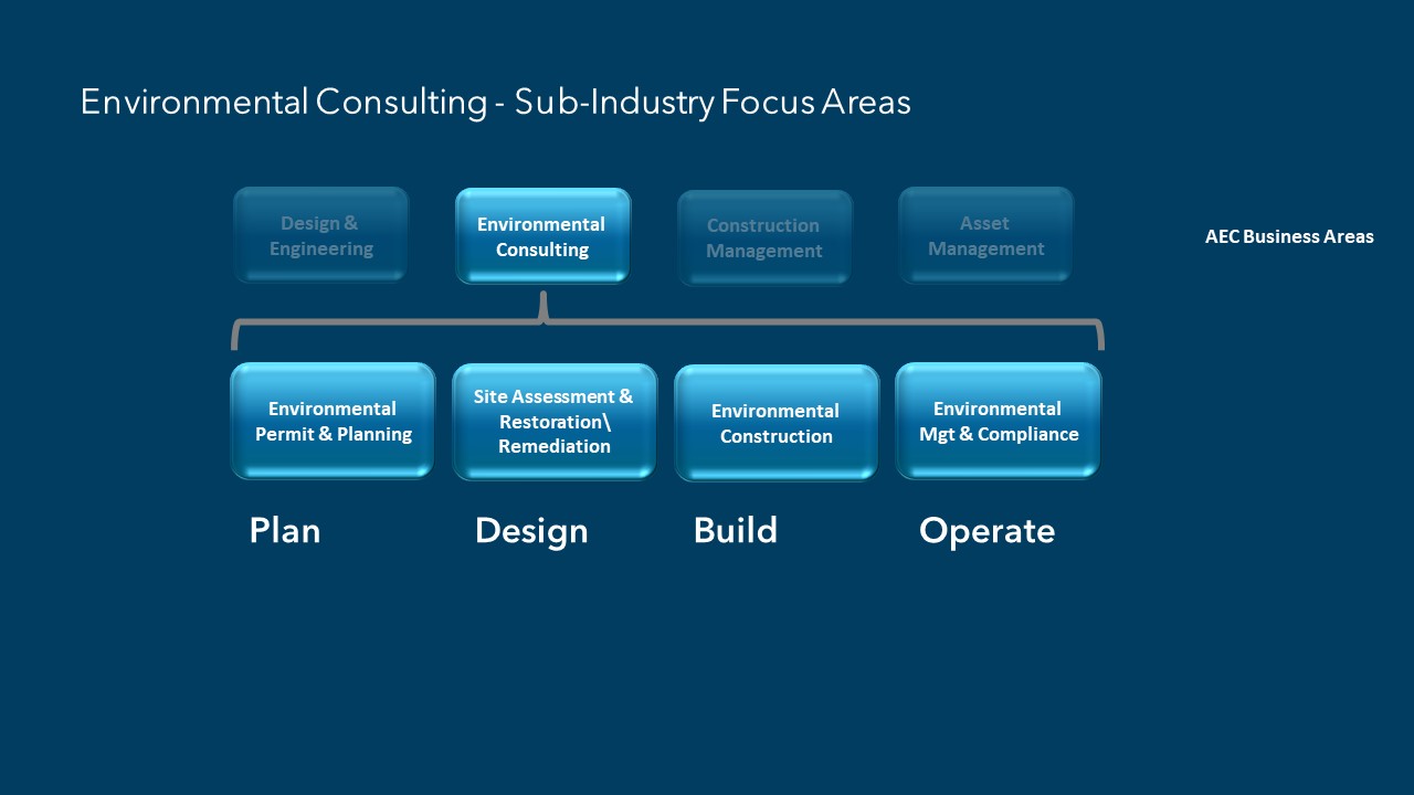 To realize this vision, Esri is focusing on four main areas that are typical to most AEC and environmental consulting firms. And the good news is that environmental consulting has been identified among the top four industry focus areas of the AEC sector at Esri. Under the environmental consulting industry, four subindustry focus areas have been identified as well: