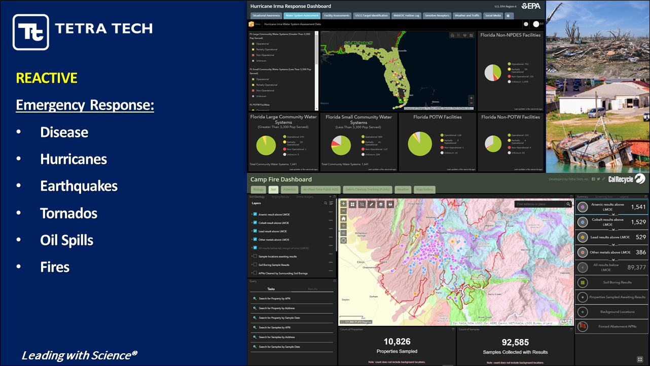 Many of our projects are impacted by climate change. Automated/mobile data collection and data visualization and management have been very important for our projects. We rely on field apps and drones, web maps, interactive maps, and dashboards for a common operating scheme for our users and clients. We have reactive and proactive projects. The reactive ones are emergency response projects such as disease, hurricanes, earthquakes, tornados, oil spills, and fires. Using real-time dashboards has been very useful. On the proactive side, we are addressing the energy crisis with renewable energy, green infrastructure and sustainable development, which aimed to mitigate climate change impacts. GIS has been a backbone for data management and visualization. Overall, I see these proactive and reactive responses to climate change to be a continued focus for the environmental consulting industry.