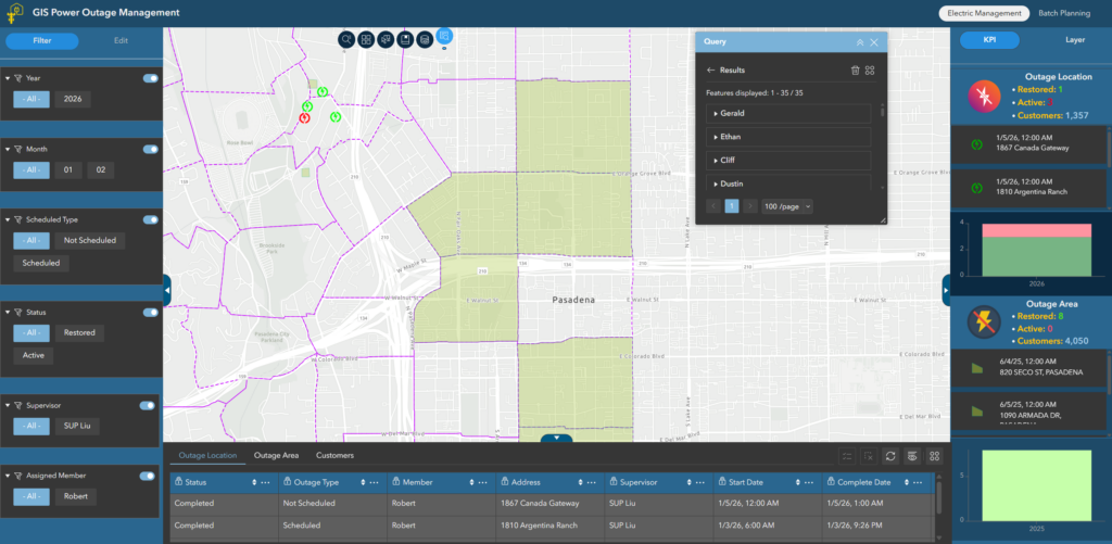 - Power Outage Management and Community Support – The Power Outage application enables staff to map outage locations and impacted areas. It created a scheduled planned outage using batch tools. The application automatically calculates affected customer counts. Finally, it exports customer lists for coordinated outreach.