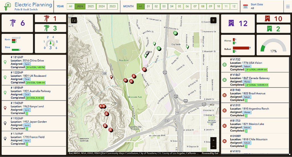 Leveraging the Water Division’s GIS approach as a model, PWP advanced the development of dedicated GIS solutions for Power operations. This effort led to the establishment of an electric-focused initiative, Power GIS Vision. Built on modern ArcGIS tools, including ArcGIS Hub, ArcGIS Experience Builder, ArcGIS Dashboards, StoryMaps, and advanced web frameworks, Power GIS Vision extends the Water Division’s applications through several targeted solutions: