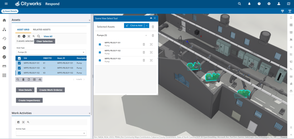 5. 3D multi-asset selection: A custom tool lets users select multiple assets directly in the 3D model and generate consolidated work orders in a single action.