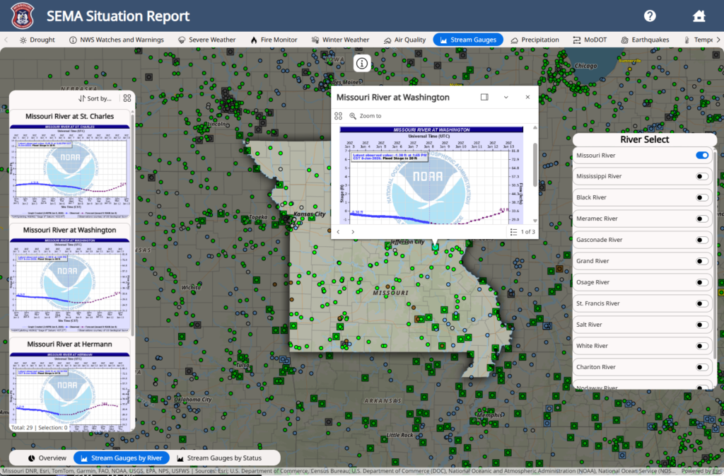 The new situational awareness report represents an up-to-the-minute version of what the daily brief PDF captures in snapshot form. And instead of waiting for the next morning’s PDF to understand what’s happening in the state, Missouri SEMA leadership and partners can now access current conditions at any time.