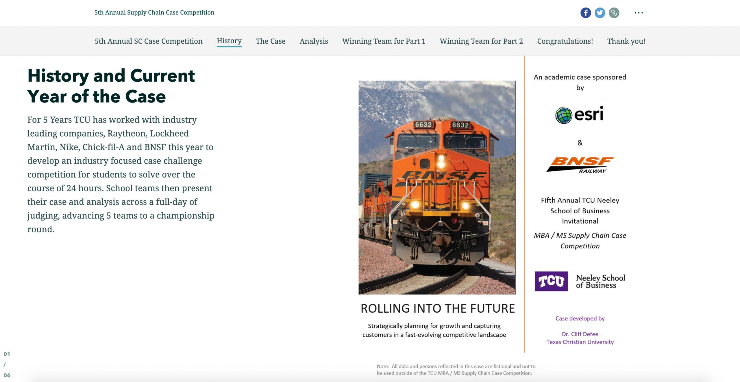 In February 2021, Esri sponsored the fifth annual TCU Supply Chain Case Competition. It featured an industry case challenge from BNSF, the nation’s largest Class rail operator, owned by Berkshire Hathaway and based in Fort Worth, Texas. The case was titled “Rolling into the Future—Strategically Planning for Growth and Capturing Customers in a Fast-Evolving Competitive Landscape.” It addressed the shifting pressures on supply chain operations providers to grow profitably while upholding the core values of the company within its community.
