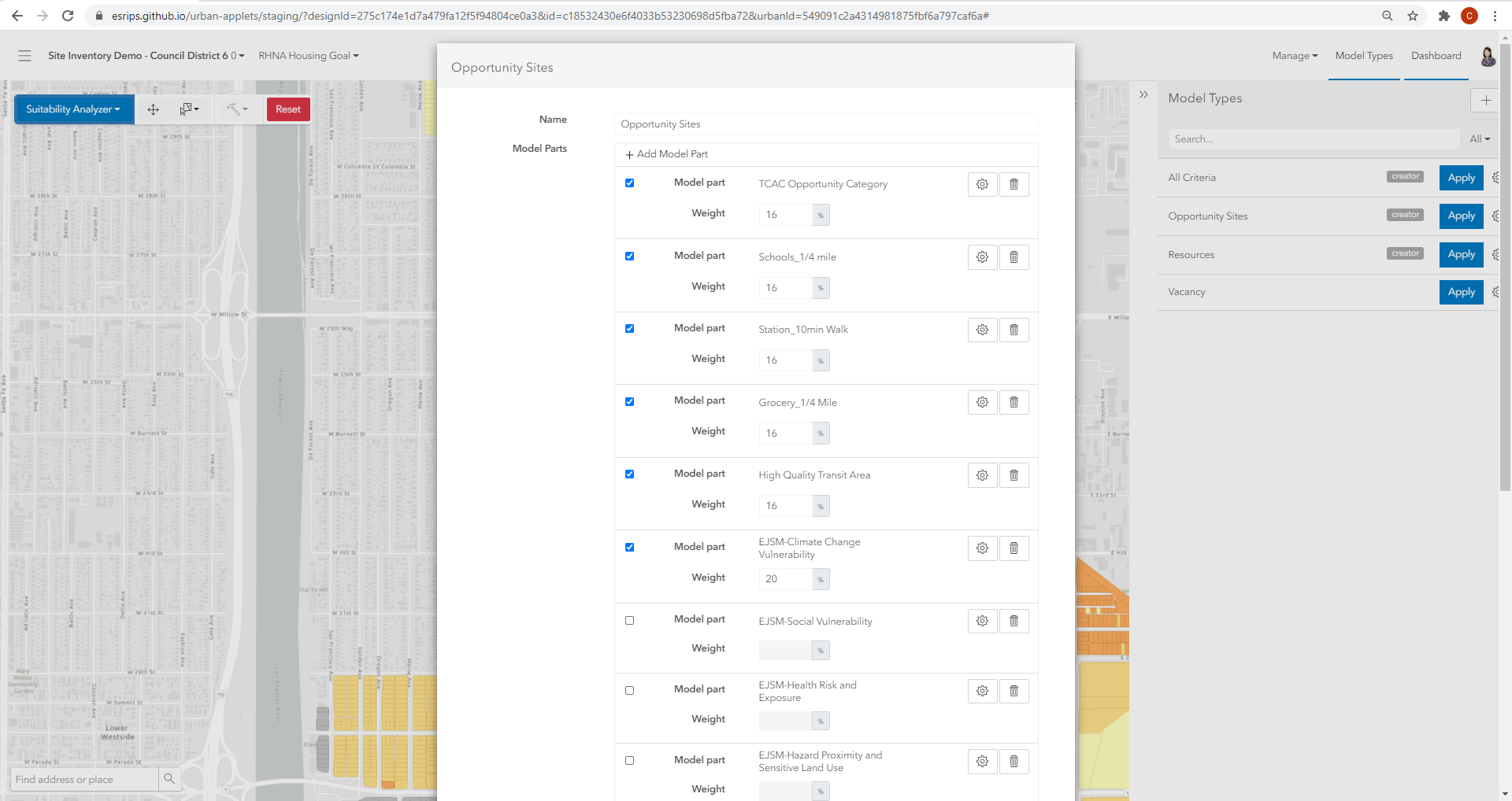 I can overlay my Renters map and my Homeowners map to understand where the most crucial needs are for affordable housing. However, there are often more factors that would drive our policy making. This is where the Policy Validation Application (PVA), an add-on to ArcGIS Urban would come into play. This allows me to take multiple variables at once, assign weights to each metric, and identify the best location for affordable housing down to the parcel level.
