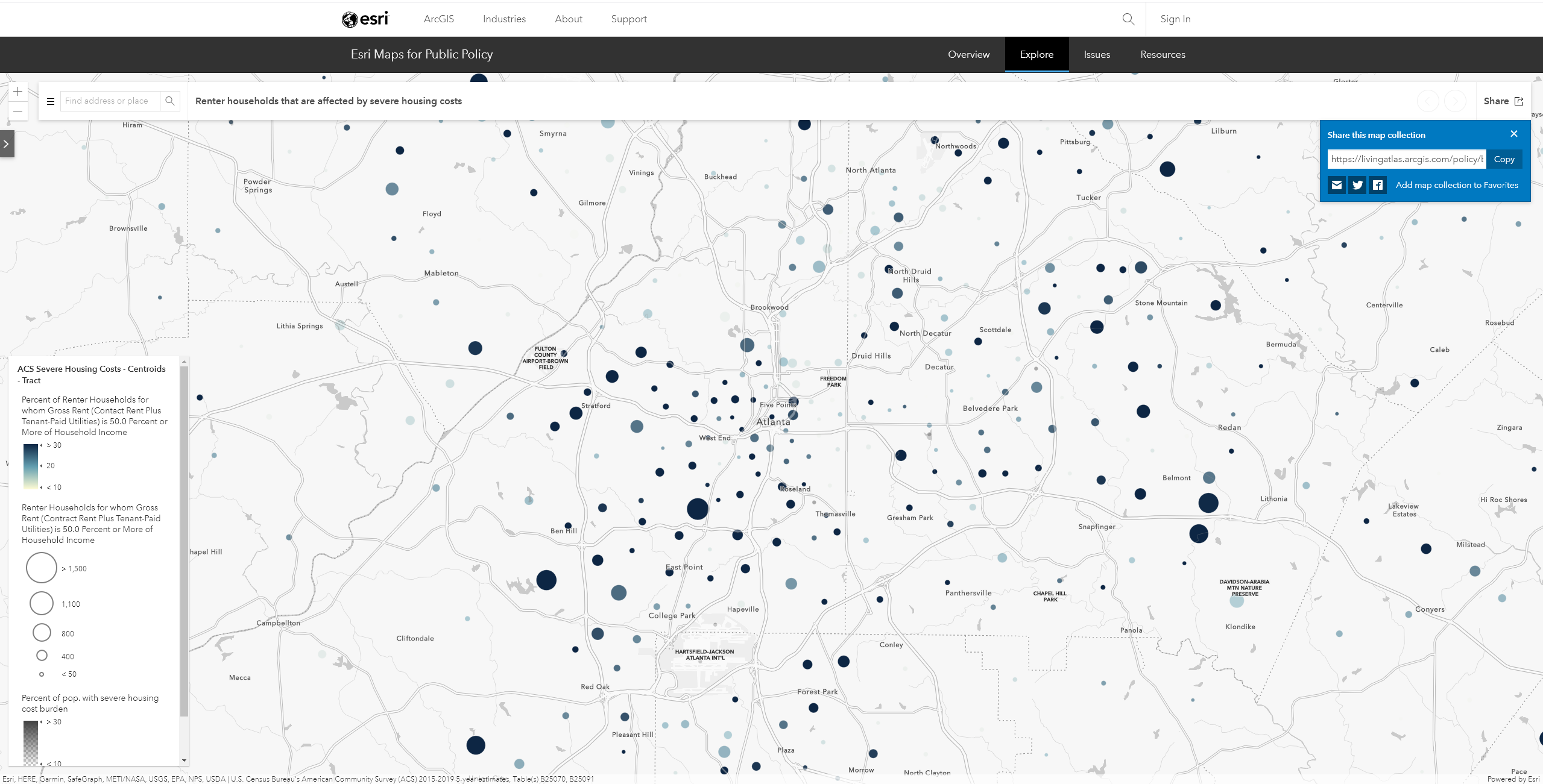 From a policy standpoint, this data helps us understand where affordable housing, combined with a sustainable economic mobility policy, is most needed. But, it’s not just homeowners that are struggling. Renters also make up a large percentage of the need for affordable housing, especially with younger generations. The Esri Maps for Public Policy app, a part of the Living Atlas, provides free access to data that can be used to help validate policy decisions. In this map, we can see where renters in the metro Atlanta area are burdened by severe housing costs.