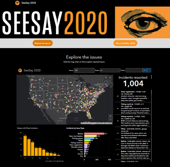 Another way to both advocate for a cause and closely engage the community is to build a crowdsourced map with data shared by the public. Democracy Labs created an app with a simple web form to help citizens report voter suppression incidents, which are then reported in the form of a dashboard and shared with the public, the media, and voting rights groups. “Think of it like an app for drivers to report traffic incidents, which then get reported in real time,” says Puri. Reported information includes location, time, the nature of the incident, and other details. The first app was built in 2018, called SeeSay 2018 (if you “see” something, “say” something), and in 2020, SeeSay 2020.