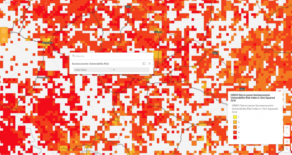 This snapshot of the Sierra Leone socioeconomic risk web map estimates the vulnerability of populations with limited options to cope with economic shocks through different risk levels. Risk-level values can be found by clicking on the map. Level 5 indicates areas with highest risk, while level 1 indicates areas with lowest risk.