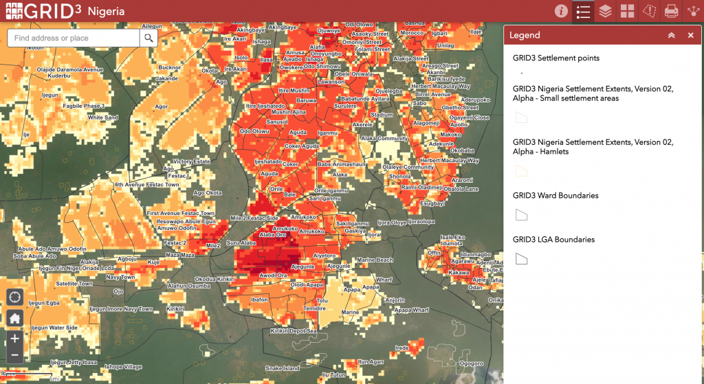 A snapshot of Lagos from the Nigeria web map visualizes GRID3 data on population and settlements.