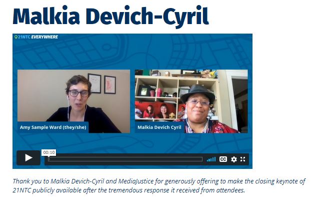 Malkia Devich-Cyril is Senior Fellow, lead founder, and former Executive Director of MediaJustice, and helped coin the term “Media Justice” in 2002, and for more than 20 years has worked against media bias and for human rights safeguards in the digital age. Have a listen to Malkia Devich-Cyril’s closing keynote on Grief and Grievance in a Digital Age.