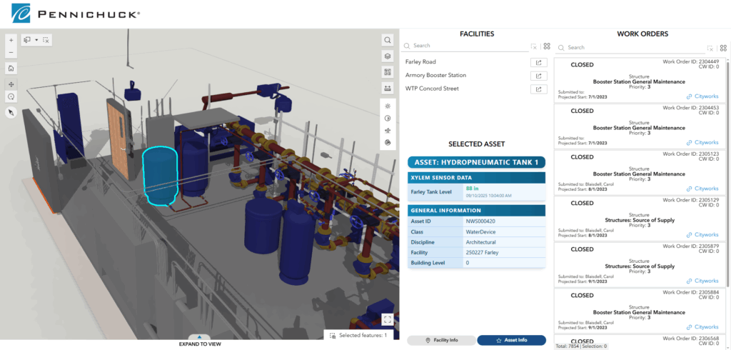 Pennichuck had already made significant strides in modernizing its distribution network model. This included upgrading their enterprise GIS, converting to ArcGIS Utility Network, upgrading to a GIS-centric work and asset management platform, and creating map-first workflows for work orders and inspections. Although these areas of the operation had been strengthened, facilities such as pump stations and treatment plants lagged behind. Represented mostly as points on a map, these facilities were still reliant on operator expertise and supported by limited, system-level tools.
