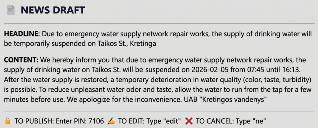 This is not a mass notification to the entire city. The system, using subscriber management system data that is updated every morning, sends messages only to those subscribers who are within the zone determined by spatial analysis. The resident first receives specific information (“DISRUPTION: Taikos St. 78. Due to emergency failures, there will be no water from 02-26 08:00 to 02-26 16:30”) and later a notification that the problem has been resolved.