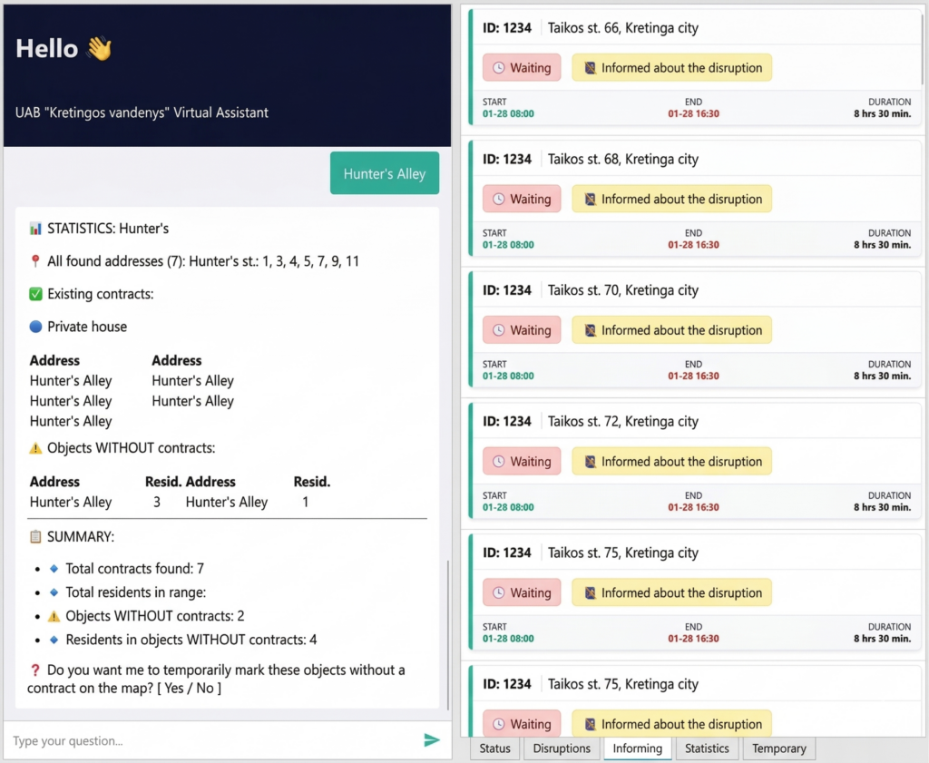 Water management company dispatch centers operate 24/7, but during weekends or at night, usually only technical personnel are on duty. If an accident occurs outside of working hours, providing high-quality information to the public becomes a challenge—it requires additional communication or IT specialists. In Lithuania, UAB Kretingos vandenys has created a system that fundamentally changes this paradigm: By utilizing spatial analysis and secure artificial intelligence, a single dispatcher can accomplish in a few minutes what previously required an entire team.