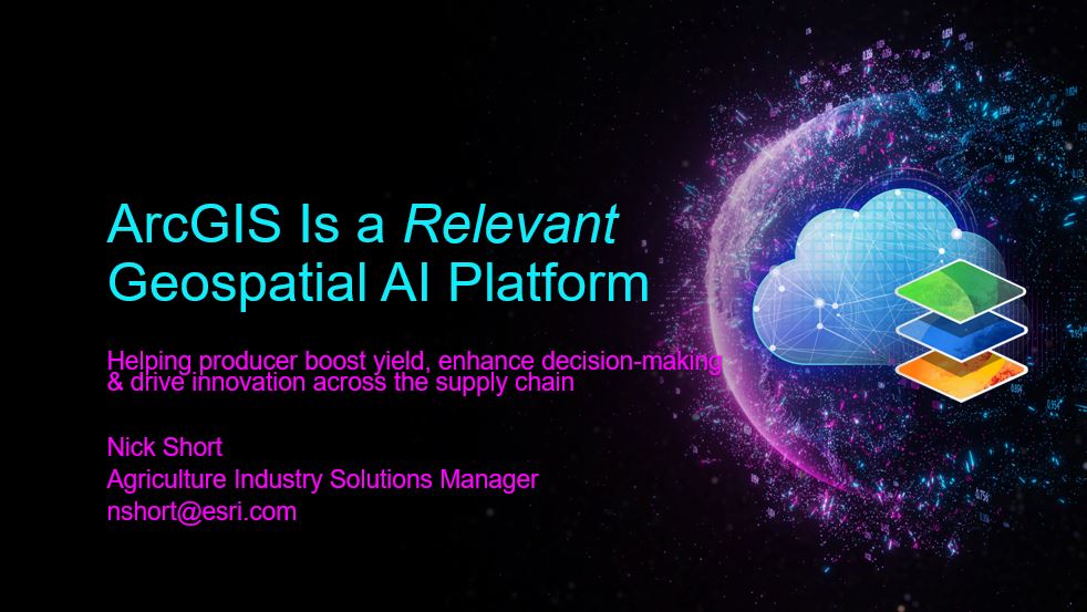 While we have heard that ArcGIS is a key Geospatial AI Platform for innovation, how can that help agriculture? This presentation briefly explained how to approach AI appropriately and in a relevant way, why now is the right time, how we can avoid past mistakes, and how Esri’s experience and longevity benefits the agriculture industry.