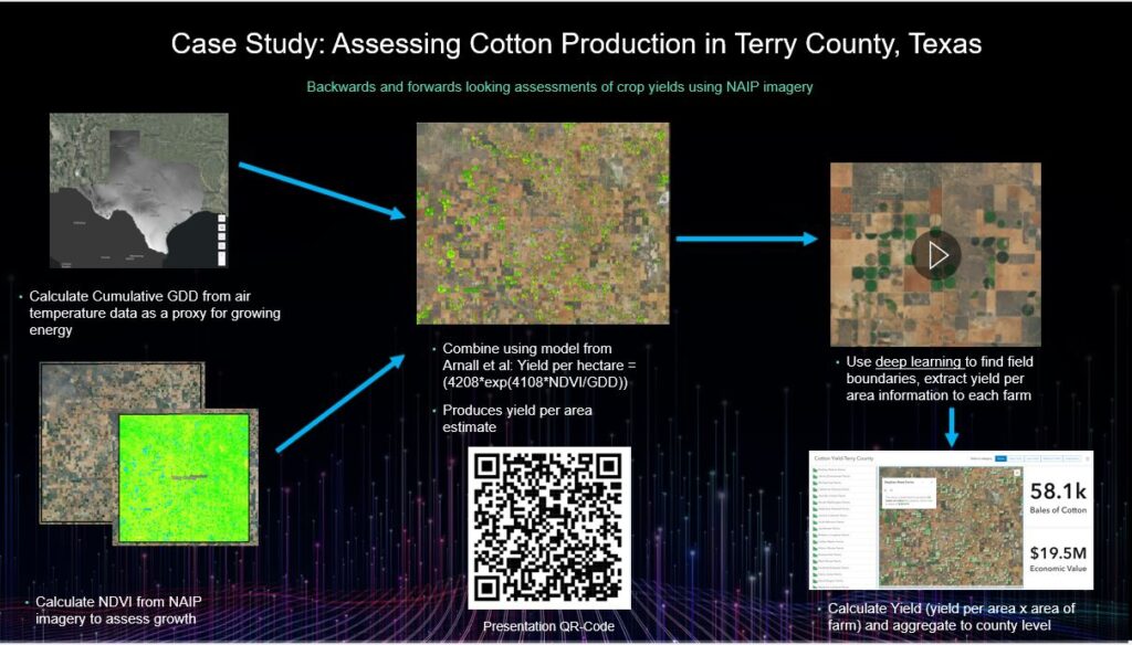 Here’s a straightforward example of estimating cotton yield in North Texas by combining temperature and vegetation data based on growing degree days (see presentation on Raster Analytics).